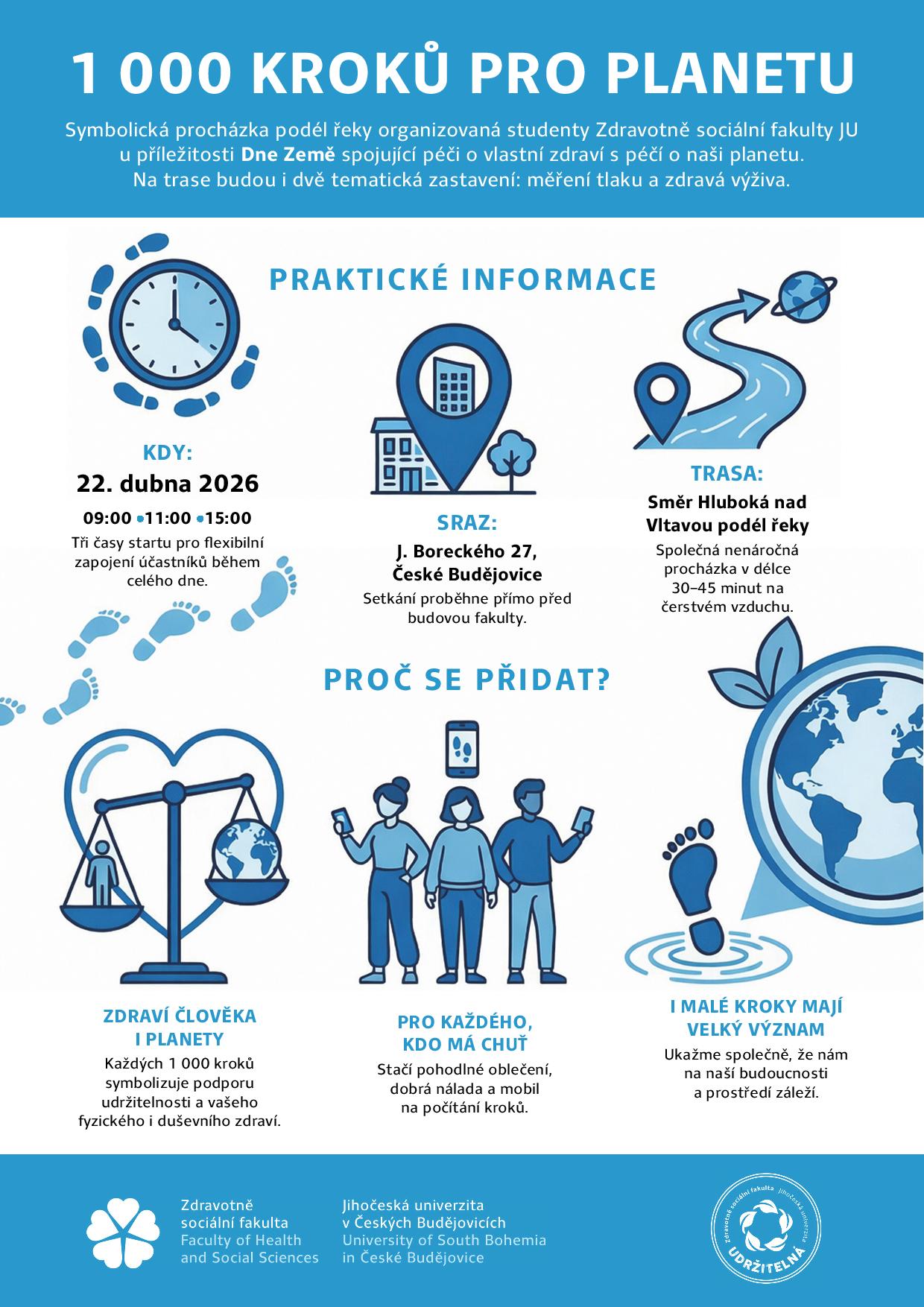 Účastníky čeká nenáročná procházka dlouhá 30 až 45 minut podél řeky Vltavy ve směru Hluboká nad Vltavou. Na trase budou i dvě tematická zastavení: měření tlaku a zdravá výživa. Akce je určená pro všechny zájemce z naší fakulty a univerzity – přidat se může každý, kdo má chuť se projít a udělat něco pro své zdraví i zdraví planety. Každých 1 000 kroků symbolizuje podporu udržitelnosti a fyzického i duševního zdraví člověka. „Tisíc kroků obnáší zhruba 0,8 km, ale pokud bude chtít někdo jít dál, samozřejmě může. Účastníkům stačí pohodlné oblečení, dobrá nálada a mobil na počítání kroků,“ shrnula za organizátory Mgr. Hana Hajduchová, Ph.D., z Ústavu ošetřovatelství, porodní asistence a neodkladné péče ZSF JU.